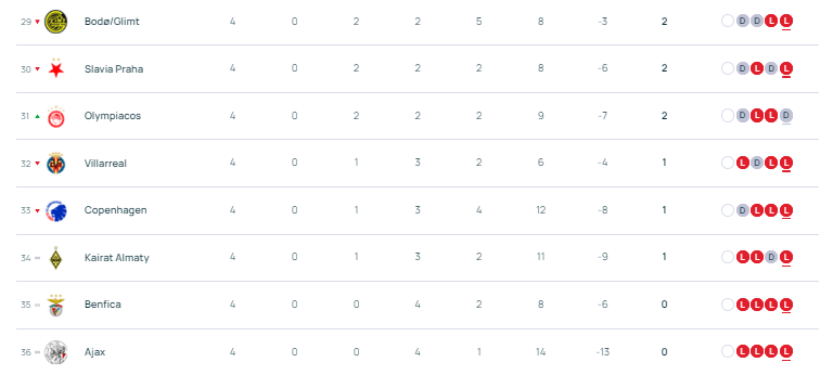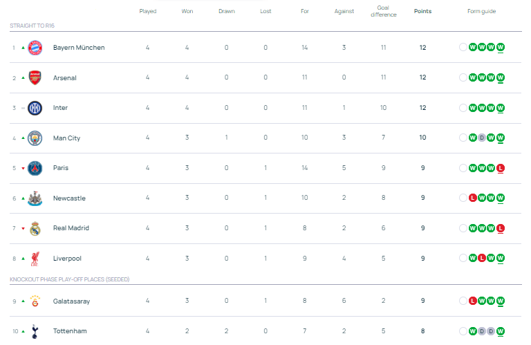 ขณะนี้ยังมีสามทีมที่ยังไม่แพ้ใคร ได้แก่ บาเยิร์น มิวนิค, อาร์เซนอล และ อินเตอร์ มิลาน ซึ่งครองสามอันดับแรกด้วยคะแนน 12 แต้มเท่ากัน บาเยิร์นและอาร์เซนอลต่างมีผลต่างประตูได้เสีย +11 แต่ยักษ์ใหญ่แห่งแคว้นบาวาเรียนำหน้าปืนใหญ่ด้วยจำนวนประตูที่ยิงได้มากกว่า (14-11) ขณะที่อินเตอร์ มิลาน อยู่อันดับสามด้วยผลต่างประตูได้เสีย +10