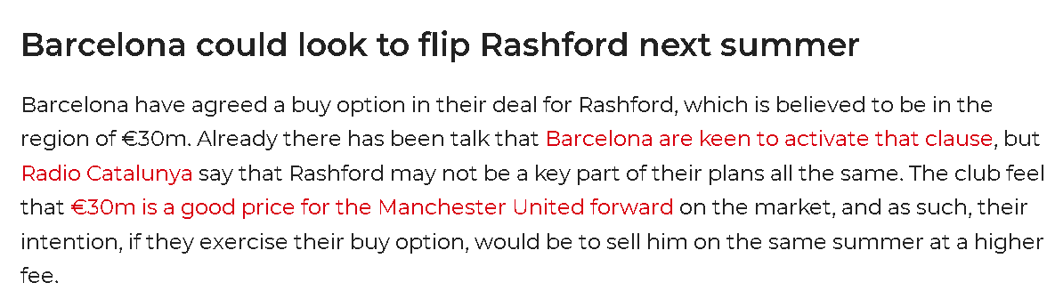 ดังนั้น คาดว่าบาร์เซโลนาจะเข้าสู่การเจรจาอย่างเป็นทางการกับแมนเชสเตอร์ ยูไนเต็ดเกี่ยวกับการย้ายทีมในอีกไม่กี่สัปดาห์ข้างหน้า หากการสนทนาเป็นไปด้วยดี การย้ายทีมถาวรจะเป็นประโยชน์ต่อทุกฝ่ายที่เกี่ยวข้อง แมนเชสเตอร์ ยูไนเต็ดจะได้รับค่าตัวจากการย้ายทีม ซึ่งทั้งหมดจะเป็นกำไรสุทธิเนื่องจากแบ็คกราวด์จากอคาเดมีของแรชฟอร์ด ขณะที่บาร์เซโลนาจะได้ผู้เล่นที่สามารถสร้างผลกระทบในลาลีกาได้ทันทีในราคาที่สมเหตุสมผล ซึ่งเป็นผลลัพธ์ที่ดีไม่ว่าพวกเขาจะเก็บเขาไว้หรือขายต่อก็ตาม