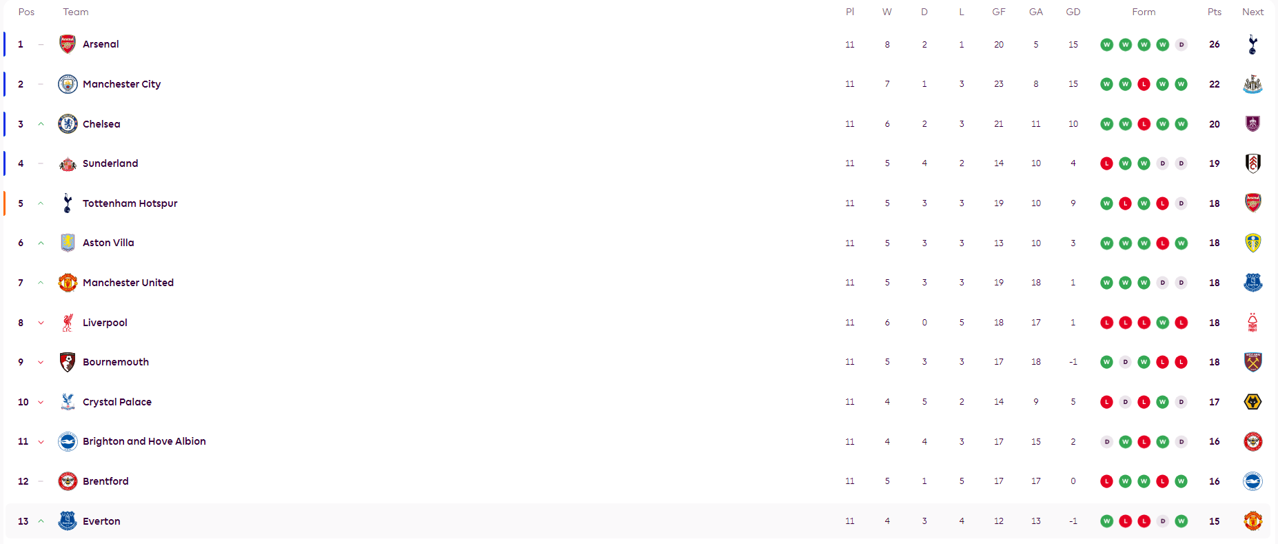 เมื่อวันที่ 10 พฤศจิกายน เวลาปักกิ่ง การแข่งขันพรีเมียร์ลีกฤดูกาล 2025-26 รอบที่ 11 ได้สิ้นสุดลงแล้ว โดยอันดับปัจจุบันเป็นดังนี้: