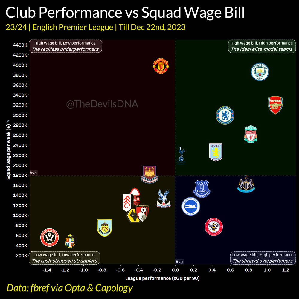 ในอดีต ค่าใช้จ่ายเงินเดือนของสโมสรทั้งหมดอยู่ที่เพียง £295.9 ล้าน แต่เพิ่มขึ้นเป็น £364.7 ล้านในฤดูกาล 2023/24! อย่างไรก็ตาม ค่าใช้จ่ายเงินเดือนทั้งหมดในฤดูกาลที่แล้วได้ลดลงมาอยู่ที่ £313 ล้านแล้วสาเหตุส่วนหนึ่งเป็นเพราะแมนเชสเตอร์ ยูไนเต็ด ได้รวมเงื่อนไขการตัดเงินเดือน 25% เป็นข้อบังคับสำหรับผู้เล่นที่ไม่สามารถผ่านเข้ารอบแชมเปียนส์ลีกได้ และอีกส่วนหนึ่งเป็นเพราะสัญญาของนักเตะใหม่ที่เซ็นเข้ามามีเงินเดือนพื้นฐานที่ต่ำกว่า แต่ได้รับการชดเชยด้วยโครงสร้างโบนัสที่เกี่ยวข้องกับผลงานอย่างมาก