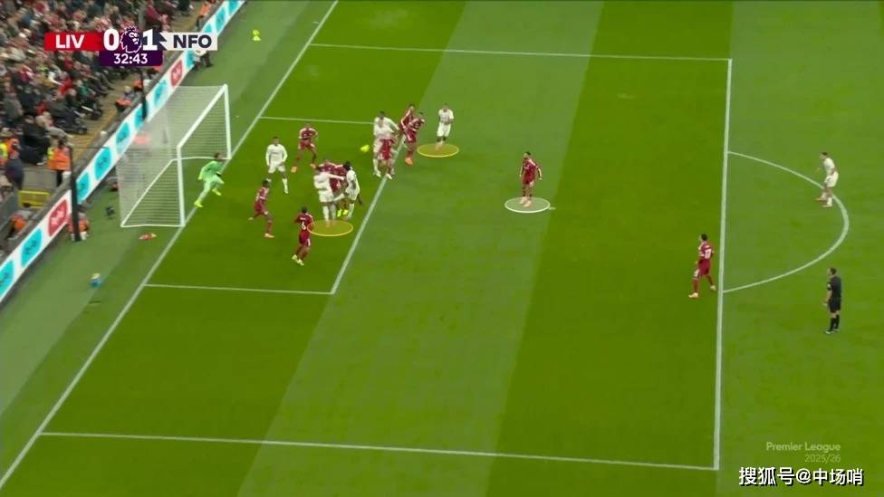 吉布斯-怀特(近门柱处黄圈)无人盯防,穆里略(远门柱处黄圈)摆脱了索博斯洛伊的防守