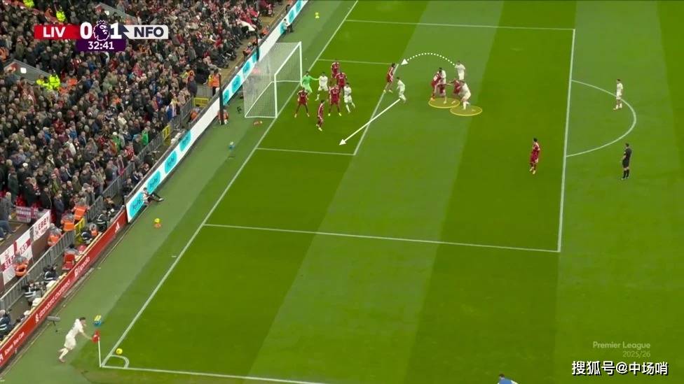 ในช่วงเริ่มต้นของการป้องกันมุมนี้ ซาลาห์ส่งสัญญาณให้แม็คคอลลิสเตอร์ กำชับให้ชาวอาร์เจนตินาตามประกบผู้เล่นที่อันตรายที่สุดของฟอเรสต์ คือ มูริลโล