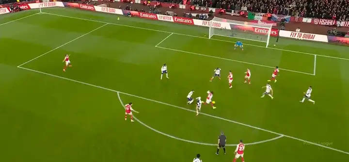 เผชิญหน้ากับแนวรับของท็อตแนมที่ผู้เล่นยืนแน่นกันเป็นกลุ่ม เขาเลือกที่จะส่งบอลโด่งข้ามหัว ด้วยการไม่หวั่นไหวต่อเสียงเชียร์จากแฟนบอล เขาจับจังหวะได้อย่างสมบูรณ์แบบ ส่งบอลลอยขึ้นฟ้า ก่อนจะข้ามศีรษะกองหลังไปอย่างสวยงาม เพื่อนร่วมทีมของเขาวิ่งมาถึงในจังหวะที่เหมาะสมพอดี และยิงวอลเลย์เข้าประตูไป