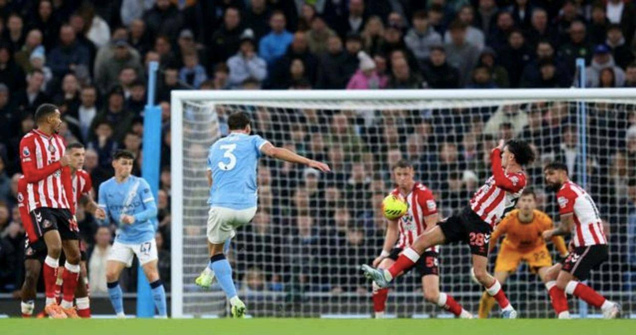 เผชิญหน้ากับซันเดอร์แลนด์ที่เล่นอย่างดุดัน แมนเชสเตอร์ ซิตี้ แสดงให้เห็นถึงการควบคุมเกมอย่างยอดเยี่ยมตั้งแต่เริ่มต้น ผ่านการจ่ายบอลและการเคลื่อนไหวที่ชาญฉลาด พวกเขาควบคุมจังหวะของเกมได้อย่างมั่นคง แม้แนวรับของซันเดอร์แลนด์จะจัดระเบียบกันอย่างแน่นหนา พยายามปิดกั้นพื้นที่โจมตีของซิตี้ด้วยการประกบตัวที่รัดกุม แต่แรงกดดันอย่างต่อเนื่องของทีม "สิงห์บลูส์" ทำให้การพังประตูแรกเป็นเพียงเรื่องของเวลาเท่านั้นการหยุดชะงักถูกทำลายลงอย่างน่าทึ่งในนาทีที่ 31รูเบน ดิอาส กองหลังของทีมซิตี้ รับบอลใกล้เส้นกลางสนาม ก่อนจะใช้เวลาสักครู่เพื่อตั้งสติ แล้วซัดลูกยิงไกลสุดแรงเกิด บอลพุ่งทะยานราวกับลูกกระสุนปืนใหญ่ หมุนควงโค้งอย่างน่าทึ่งเข้าประตูไปอย่างสวยงามที่มุมบนสุด ทำให้ผู้รักษาประตูฝ่ายตรงข้ามหมดสิทธิ์รับอย่างสิ้นเชิง ประตูสุดมหัศจรรย์นี้ไม่เพียงแต่ทำให้ทีมซิตี้ขึ้นนำเท่านั้น แต่ยังจุดประกายความคลั่งไคล้ให้กับแฟนบอลเจ้าบ้านอีกด้วย