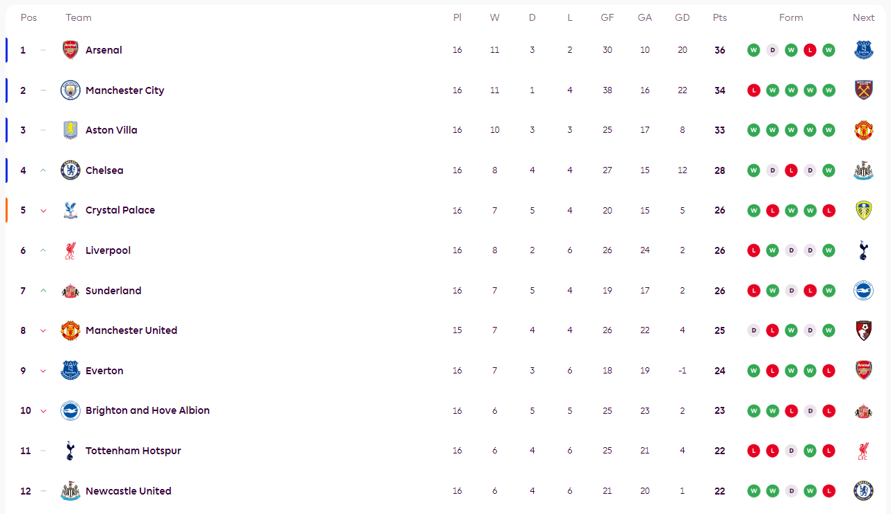 ตารางคะแนนพรีเมียร์ลีก: อาร์เซนอลนำแมนเชสเตอร์ ซิตี้อยู่สองแต้ม และนำแอสตัน วิลล่าอยู่สามแต้ม; ท็อตแน่ม ฮ็อตสเปอร์ และนิวคาสเซิล ยูไนเต็ด ตกลงมา _แมนเชสเตอร์ ยูไนเต็ด_ คริสตัล พาเลซ_ แมนเชสเตอร์ ยูไนเต็ด