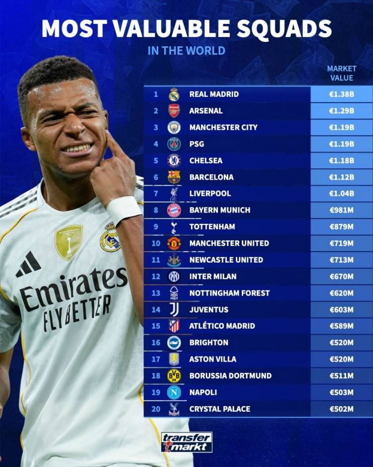 เมื่อวันที่ 25 ธันวาคม ตามเวลาปักกิ่ง เว็บไซต์ Transfermarkt ของเยอรมันได้เปิดเผยการประเมินมูลค่าสโมสรประจำปี โดยเรอัล มาดริดครองอันดับหนึ่งด้วยมูลค่า 1.38 พันล้านยูโร อาร์เซนอลและแมนเชสเตอร์ ซิตี้ ซึ่งครองอันดับสองและสามในตารางพรีเมียร์ลีก ได้ครองตำแหน่งในสามอันดับแรกเช่นกัน