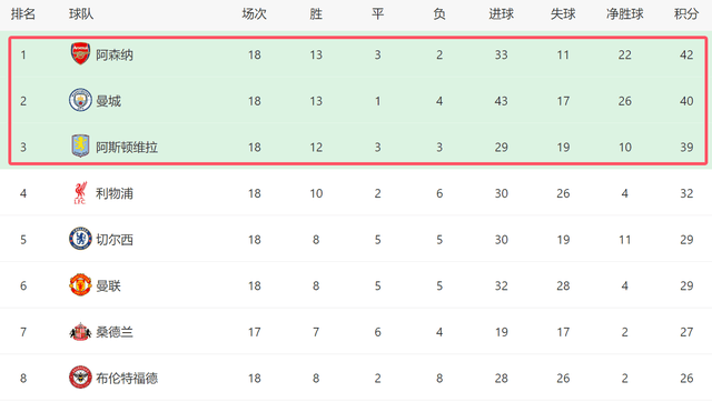 เนื่องจากทั้งอาร์เซนอลและแมนเชสเตอร์ ซิตี้ ต่างก็คว้าชัยชนะ 2-1 เหนือคู่แข่งของตนในรอบการแข่งขันนี้ อันดับบนตารางคะแนนยังคงไม่เปลี่ยนแปลง อาร์เซนอลยังคงครองตำแหน่งจ่าฝูง โดยมีคะแนนนำแมนเชสเตอร์ ซิตี้ ทีมอันดับสองอยู่สองคะแนน ขณะที่แอสตัน วิลล่า ตามหลังจ่าฝูงอยู่สามคะแนนและยังคงรั้งอันดับสามต่อไป โดยบังเอิญ อาร์เซนอลจะเป็นเจ้าบ้านรับการมาเยือนของแอสตัน วิลล่าในนัดถัดไป ซึ่งผลการแข่งขันนัดนี้จะส่งผลกระทบอย่างมากต่อตารางคะแนนลีก