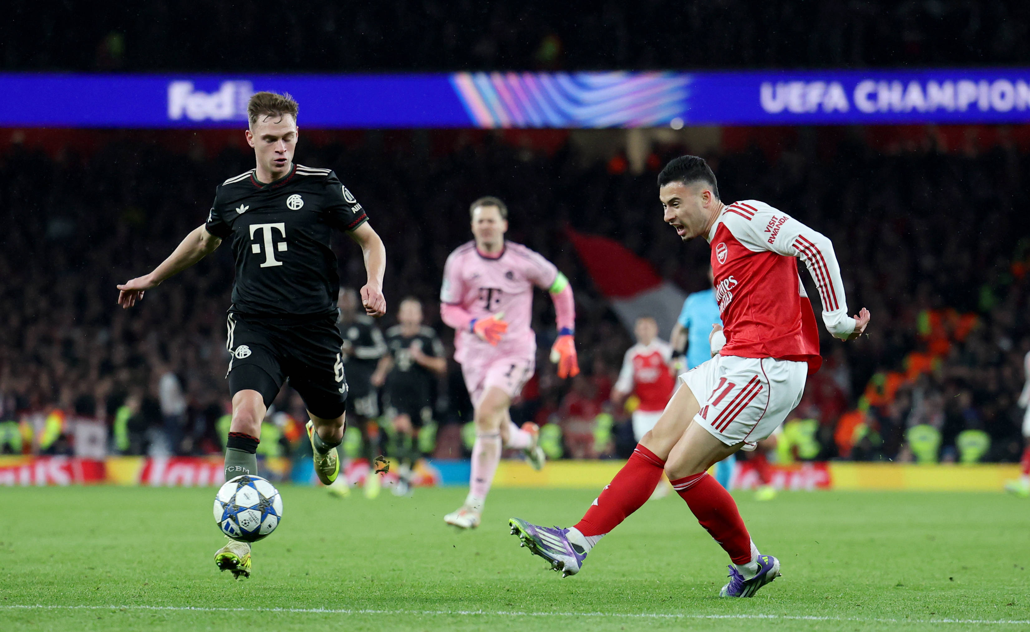 เมื่อวันที่ 26 พฤศจิกายน กาเบรียล มาร์ติเนลลี ของอาร์เซนอล (ขวา) เข้าปะทะลูก้า สตานิซิช ของบาเยิร์น มิวนิค เพื่อแย่งบอล ภาพโดย หลี่ หยิง สำนักข่าวซินหัว
