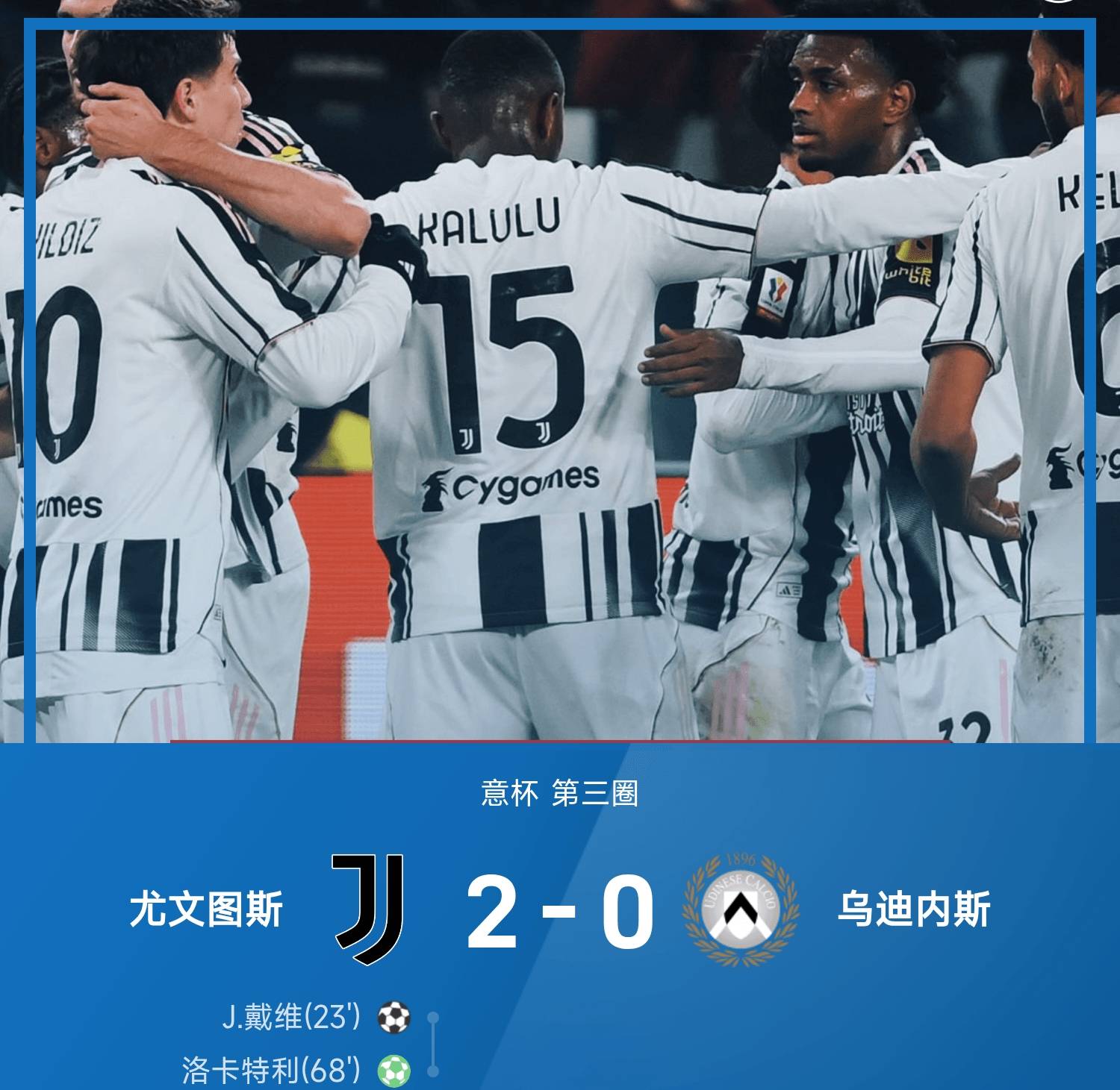 ในรอบที่สามของโคปปา อิตาเลีย ฤดูกาล 2025/26 ยูเวนตุสเอาชนะอูดิเนเซ่ 2-0ในครึ่งแรก เดวิดเป็นผู้ทำประตูแรกให้กับยูเวนตุส หลังจากพักครึ่ง โลคาเตลลีทำประตูที่สองจากจุดโทษ ในช่วงทดเวลาบาดเจ็บ โอปันดาทำประตูได้ แต่ประตูถูกยกเลิกเนื่องจากล้ำหน้า สกอร์สุดท้ายยังคงอยู่ที่ 2-0 ทำให้ยูเวนตุสผ่านเข้ารอบต่อไปได้อย่างสบายๆ โดยเอาชนะอูดิเนเซ่ไปได้