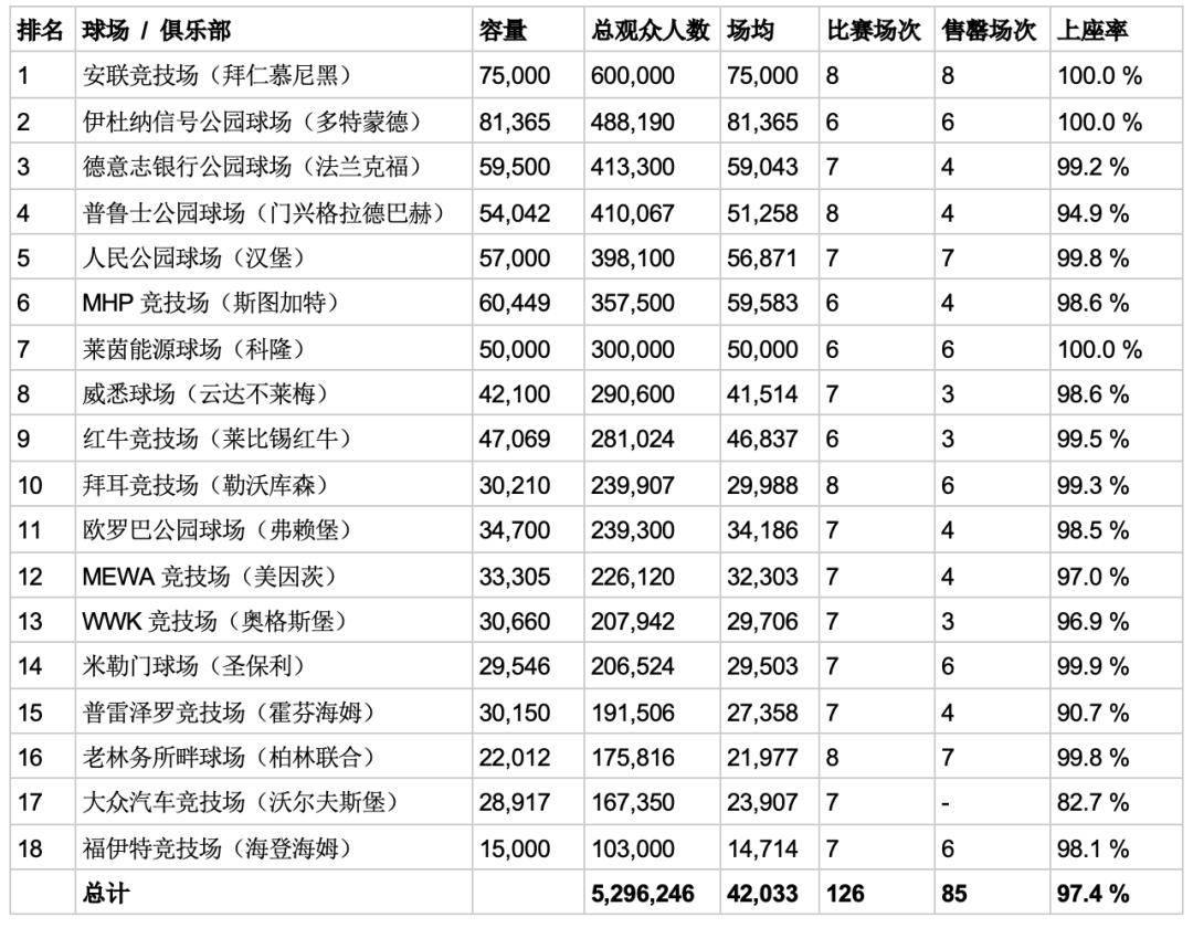 ในบรรดาเหล่านี้ โบรุสเซีย ดอร์ทมุนด์ โดดเด่นเหนือกว่าทีมอื่น ๆ อย่างชัดเจน ด้วยจำนวนผู้ชมเฉลี่ย 81,365 คนต่อนัด ซึ่งเป็นผลมาจากความจุอันมหาศาลของสนามซิกนัล อิดูนา พาร์ค