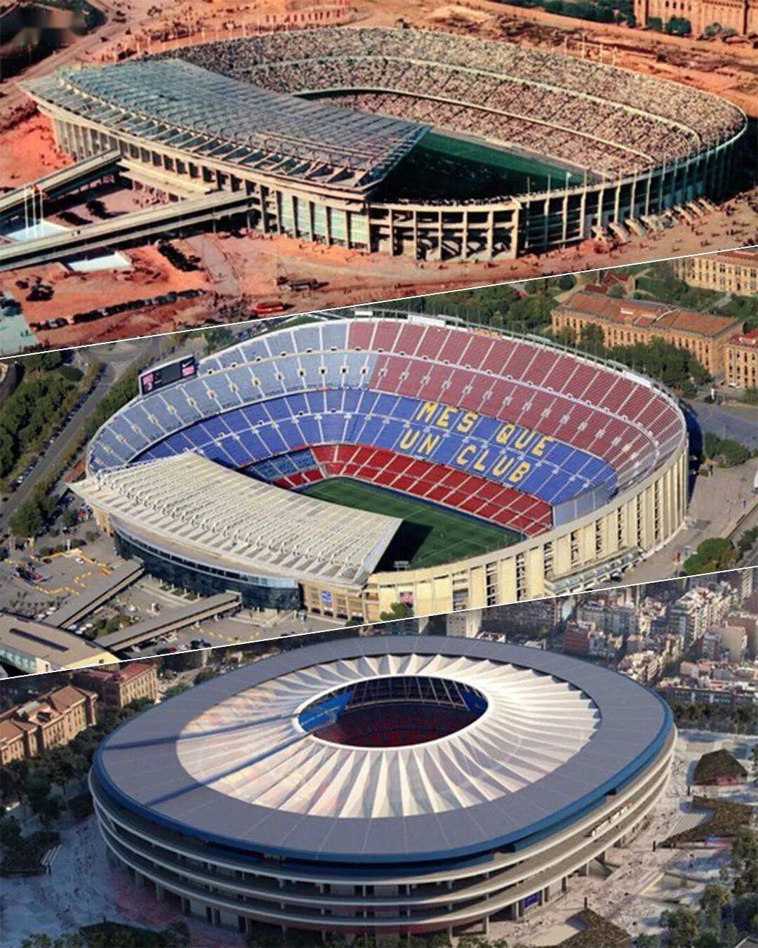 การเปลี่ยนแปลงสามครั้งของคัมป์นู: ภาพบน: สนามกีฬาเมื่อสร้างเสร็จในปี 1957 (ความจุประมาณ 93,000 คน); ภาพกลาง: สนามกีฬาก่อนการปรับปรุงล่าสุด (ความจุ 99,354 คน); ภาพล่าง: 'คัมป์นูใหม่' ที่กำลังจะสร้างเสร็จ ซึ่งจะขยายความจุเป็น 105,000 คน และยังคงสถานะเป็นสนามกีฬาฟุตบอลที่ใหญ่ที่สุดในยุโรป