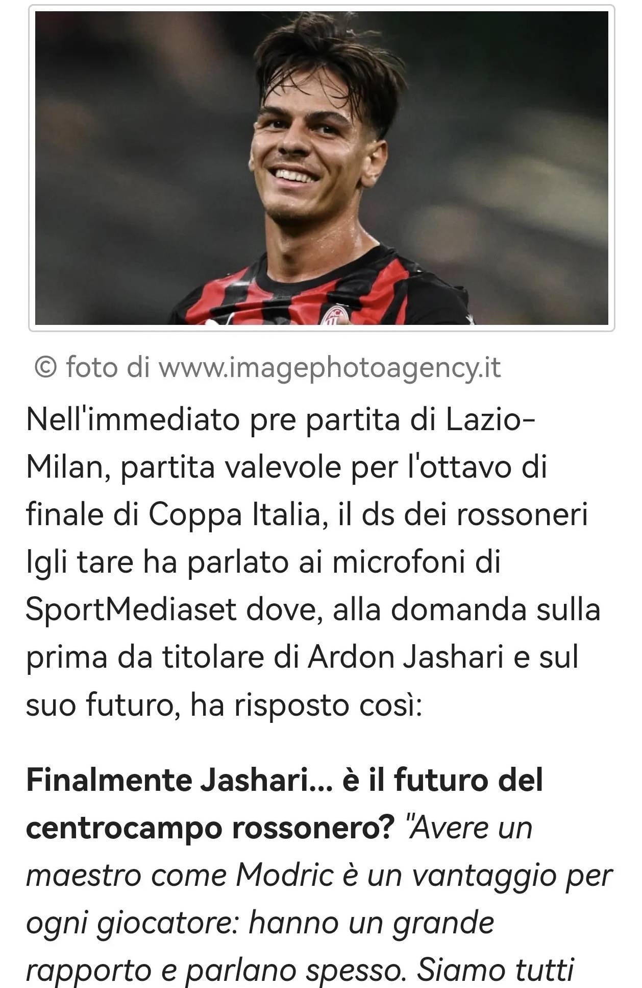ก่อนการแข่งขันโคปปา อิตาเลีย รอบ 16 ทีมสุดท้ายระหว่างลาซิโอกับมิลาน ผู้อำนวยการกีฬาของรอสโซเนรี อิลกี ทาเร ได้ตอบคำถามเกี่ยวกับการเดบิวต์ครั้งแรกในทีมชุดใหญ่ของอาโดน ยาซารี และอนาคตของเขาในระหว่างการให้สัมภาษณ์กับสปอร์ตมีเดีย กรุ๊ป: