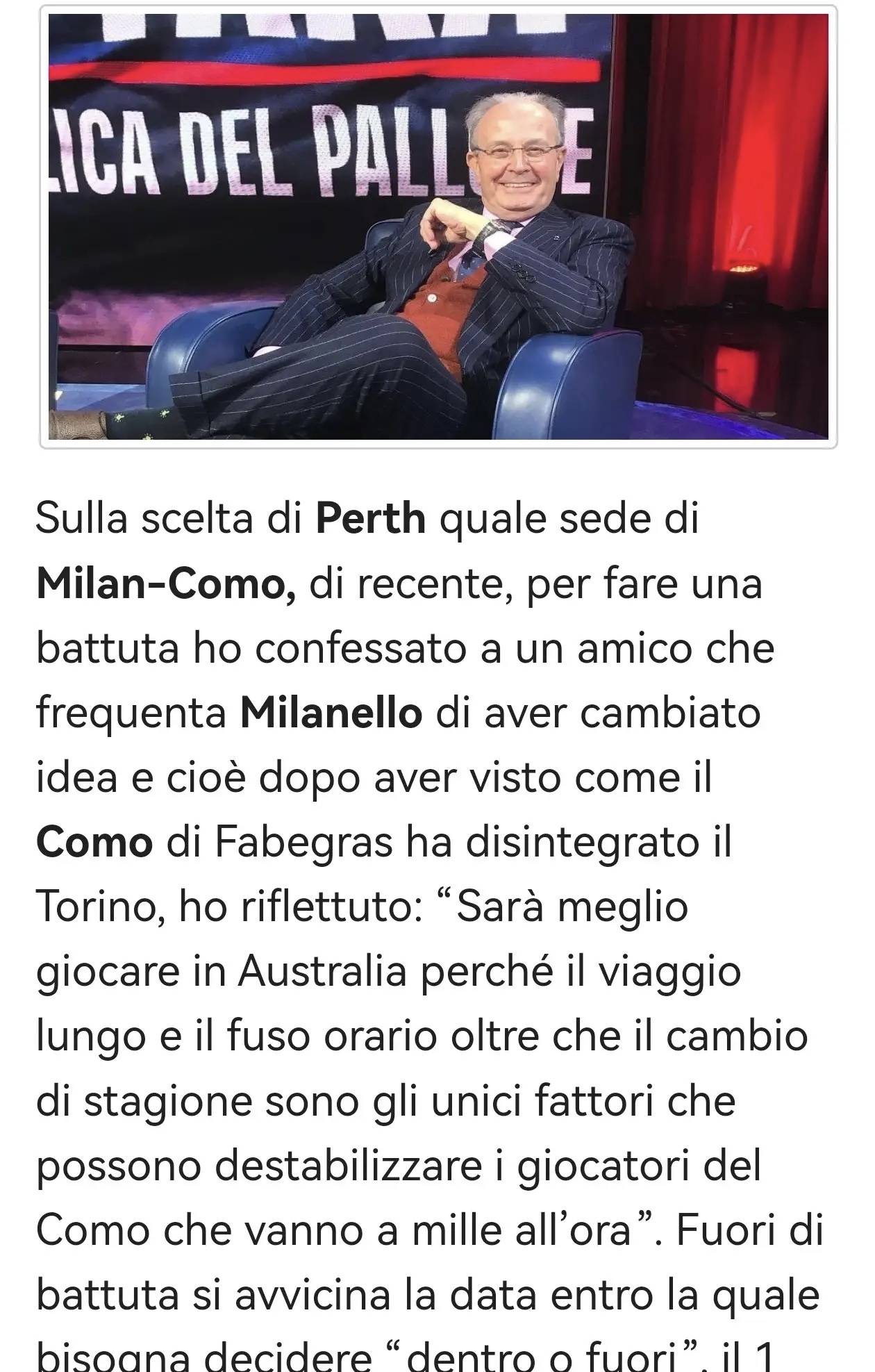 เกี่ยวกับการเลือกเพิร์ธเป็นสถานที่จัดการแข่งขันระหว่างมิลานกับโคโม ฉันเพิ่งล้อเล่นกับเพื่อนที่ไปมิลาเนลโลบ่อยๆ ว่า: