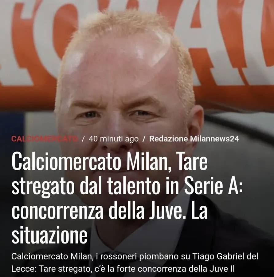 ตามรายงานของ Milannews24 เอซี มิลาน ยังคงจับตาดูตลาดนักเตะดาวรุ่งอย่างใกล้ชิดด้วยความสนใจอย่างยิ่ง แผนกแมวมองของรอสโซเนรีได้เล็งเห็นนักเตะดาวรุ่งที่มีแววอนาคตไกลคนหนึ่ง นั่นคือ ติอาโก้ กาเบรียล กองหลังรายนี้ได้กลายเป็นจุดสนใจในการแย่งชิงตัวในตลาดนักเตะภายในประเทศ โดยมียูเวนตุสเข้าร่วมแข่งขันด้วยเช่นกัน
