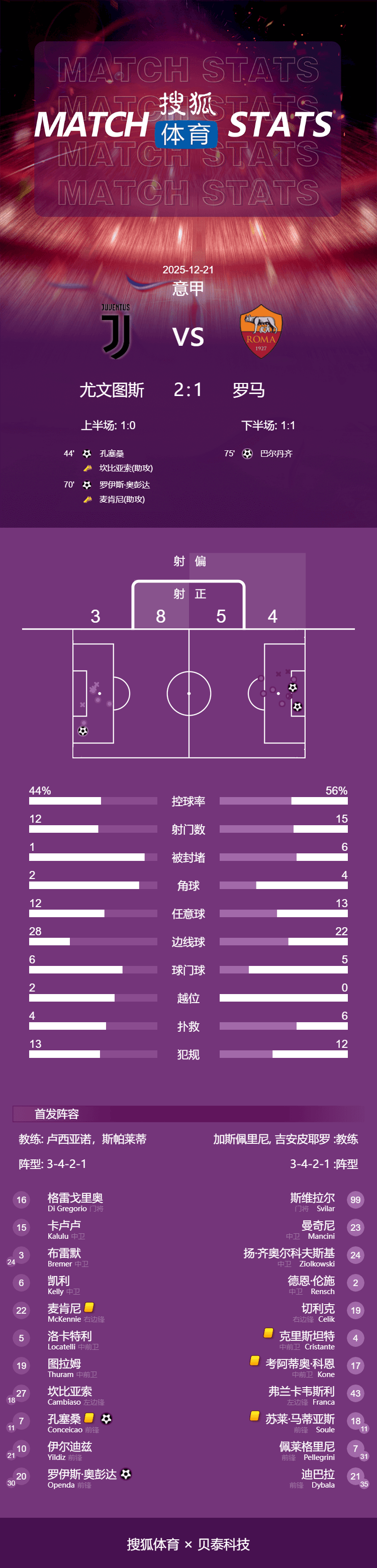 เวลา 03:45 น. ตามเวลาปักกิ่ง วันที่ 21 ธันวาคม ยูเวนตุสเปิดบ้านรับการมาเยือนของโรม่า ในรอบที่ 16 ของเซเรีย อาในครึ่งแรก คอนซันทำประตูเบิกร่องหลังจากได้รับการช่วยเหลือจากคัมเบียสโซ่ หลังจากพักครึ่ง ออปานด้าทำประตูเพิ่มเป็น 2-0 ด้วยประตูแรกในเซเรียอา ก่อนที่บัลดานซีจะตีตื้นให้โรม่า 1-2 ในที่สุด ยูเวนตุสก็สามารถรักษาชัยชนะไว้ได้ 2-1 จากผลการแข่งขันนี้ โรม่ายังคงอยู่ในอันดับที่ 4 ของตารางคะแนนลีก ขณะที่ยูเวนตุสอยู่ในอันดับที่ 5 โดยช่องว่างระหว่างทั้งสองทีมเหลือเพียง 1 คะแนนเท่านั้น