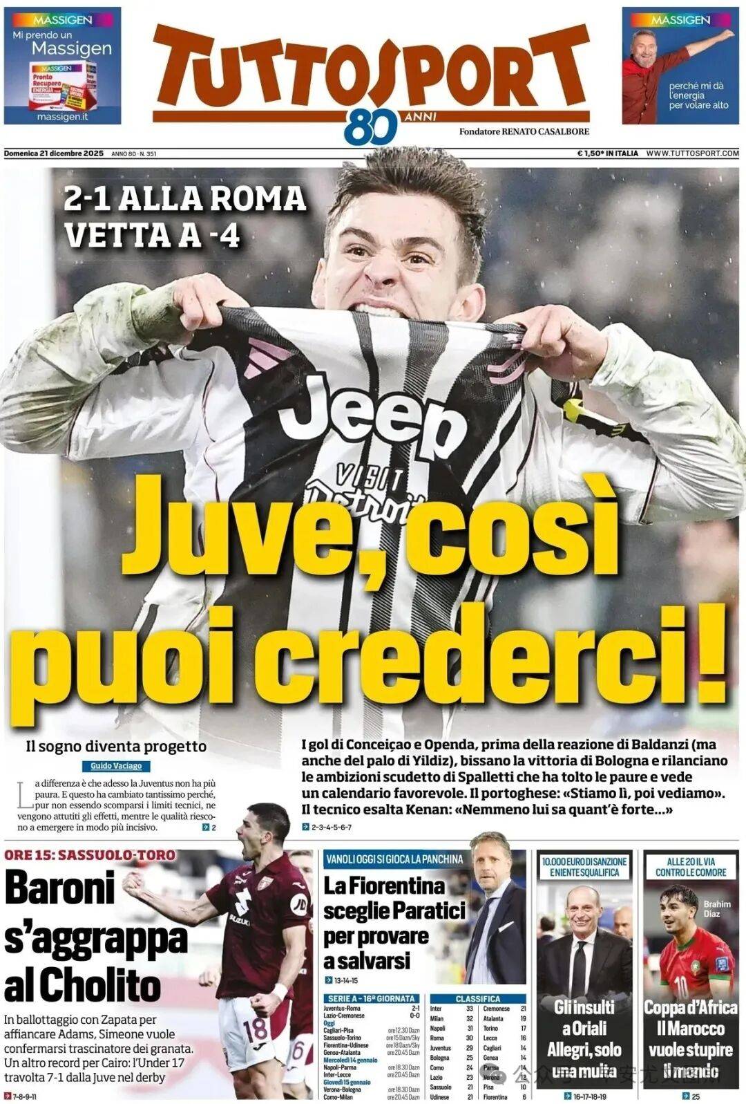 ชัยชนะอันยิ่งใหญ่ของลูซิโอ: พลังขับเคลื่อนของสปัลเล็ตติ ยูเวนตุสโชว์ฟอร์มเหนือชั้นเอาชนะโรมาที่ไร้ชีวิตชีวาไปได้ 2-1ทำให้ทีมของกัสเปรินีร่วงไปอยู่อันดับที่ 5 มีคะแนนตามหลังผู้นำอย่างอินเตอร์เพียง 4 คะแนนเท่านั้นคอนเซเซาทำลายความเงียบ, โอปันดาทำประตูที่สอง, บัลดานซีฉายแสง, และอิลดิซยิงชนเสา. จัลโลรอสซีต้องจ่ายราคาจากความผิดพลาดในการป้องกันและการขาดผู้เล่นหมายเลขเก้าที่เหมาะสม.