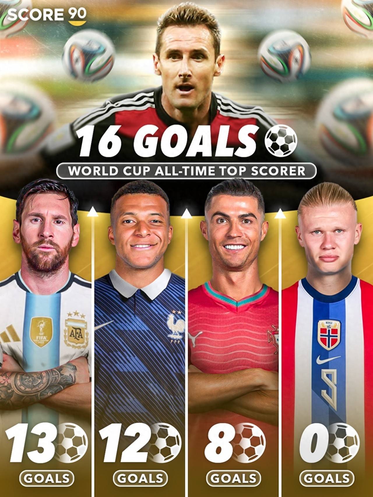 ผู้ทำประตูสูงสุดตลอดกาลของฟุตบอลโลก: เมสซี่ 13 ประตู, เอ็มบัปเป้ 12 ประตู – ใครจะสามารถทำลายสถิติ 16 ประตูของคลอเซ่ได้? ประตู | ขยาย | คริสเตียโน่ โรนัลโด้