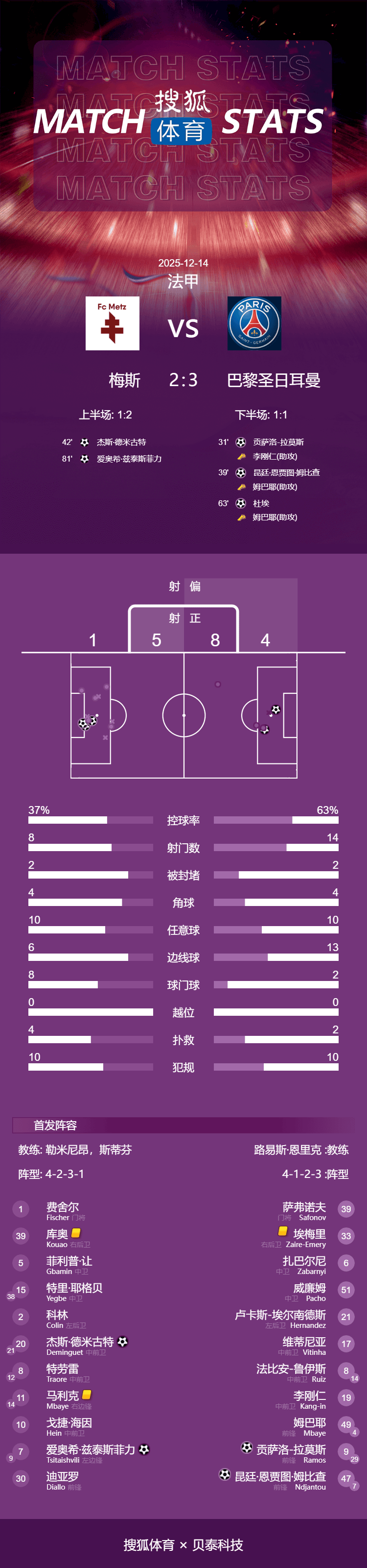 เวลา 02:00 น. ตามเวลาปักกิ่ง วันที่ 14 ธันวาคม การแข่งขันลีกเอิง ฤดูกาล 2025-26 นัดที่ 16 ได้เริ่มต้นขึ้นแล้ว แชมป์เก่า ปารีส แซงต์-แชร์กแมง คว้าชัยชนะนอกบ้านเหนือเม็ตซ์ 3-2 ที่สนามสตาดแซงต์-ซุลพิส ขยายสถิติชนะติดต่อกันในลีกเป็นสองนัด รามอส และเอ็นโกโล่ ก็องเต้ ทำประตูติดต่อกันให้เปแอสเชนำห่างสองประตู ก่อนที่เดมองจ์จะตีตื้นขึ้นมาในครึ่งหลัง ดูเอและซิตเซสวิลีต่างทำประตูได้คนละหนึ่งลูก นอกจากนี้ อิบราฮิม เอ็มบาย ผู้ทำสองแอสซิสต์ ยังยิงไปชนเสาจากโอกาสหนึ่งของเขาอีกด้วย