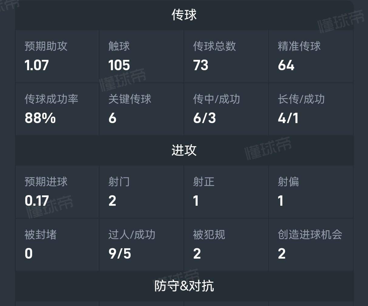 นอกเหนือจากไฮไลท์การแอสซิสต์แล้ว เชอร์กี้ดูเหมือนจะมีแม่เหล็กติดรองเท้าตลอดทั้งเกม เคลื่อนที่ผ่านกองหลังอย่างง่ายดายหลายครั้งในขณะที่การจ่ายบอลที่เฉียบคมของเขาตัดผ่านแนวรับของฝ่ายตรงข้ามซ้ำแล้วซ้ำเล่า หลังจบเกม เขาได้รับการยกย่องให้เป็นนักเตะยอดเยี่ยมประจำการแข่งขันอย่างไม่มีข้อโต้แย้ง แผนที่ความร้อนและข้อมูลสถิติแสดงให้เห็นอย่างชัดเจนถึงความเหนือชั้นของเขาทางริมเส้นฝั่งขวา