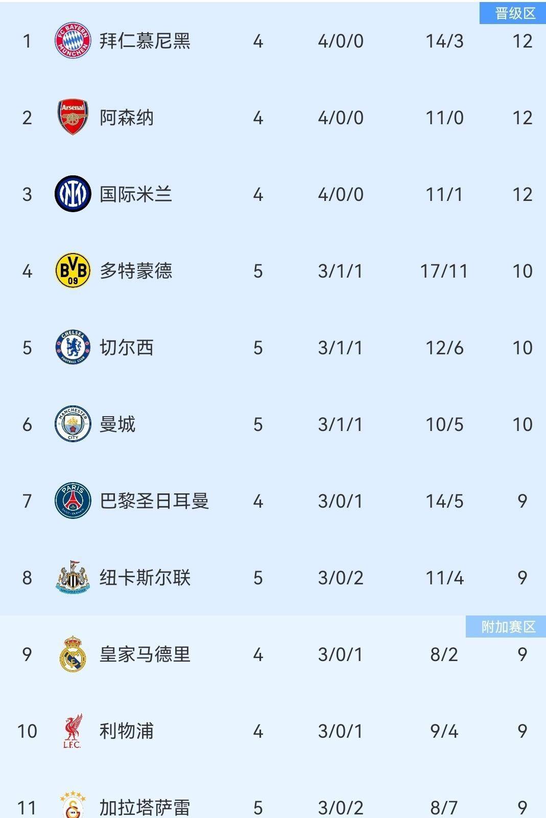 หลังจากรอบการแข่งขันนี้ บาเยิร์น มิวนิค, อาร์เซนอล และอินเตอร์ มิลาน ต่างครองตำแหน่งจ่าฝูงด้วยคะแนน 12 แต้มจากชัยชนะ 4 นัด โดยแต่ละทีมมีผลต่างประตูได้เสียมากกว่า 10 ประตู ในบรรดาทีมยักษ์ใหญ่แบบดั้งเดิม เรอัล มาดริด, ลิเวอร์พูล และปารีส แซงต์-แชร์กแมง ตามมาติดๆ ด้วยคะแนน 9 แต้มเท่ากัน กลุ่มกลางตารางมีการแข่งขันที่ดุเดือด โดยโบรุสเซีย ดอร์ทมุนด์, เชลซี และแมนเชสเตอร์ ซิตี้ มีคะแนนเท่ากันที่ 10 คะแนน ครองอันดับที่สี่ถึงหกตามลำดับเนื่องจากผลต่างประตูได้เสียที่แตกต่างกัน ไบเออร์ เลเวอร์คูเซ่น ขยับขึ้นสู่อันดับที่ 13 ด้วยคะแนน 8 คะแนนหลังจากเอาชนะแมนเชสเตอร์ ซิตี้
