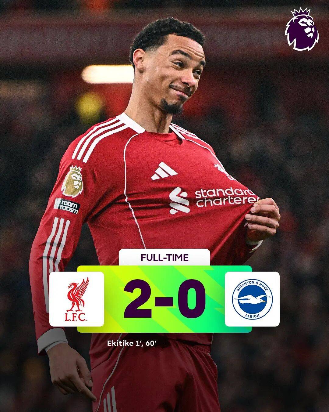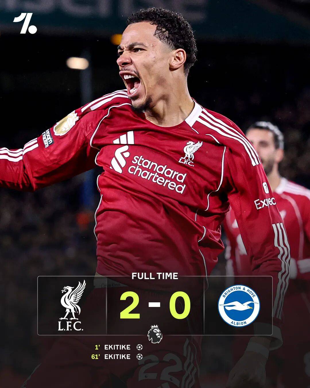 หลังจากหายไปนาน ซาลาห์ยังคงหาฟอร์มของตัวเองไม่เจออย่างชัดเจน ในขณะที่เอกิติเป็นแรงขับเคลื่อนหลักในการโจมตีของลิเวอร์พูลในนัดนี้ สร้างโอกาสทำประตูให้กับทีมแดงมากที่สุดไบรท์ตันเกือบจะตีเสมอได้ในช่วงต้นครึ่งหลัง แต่ลูกวอลเลย์พุ่งตัวของดิเอโก้ โกเมซถูกเสาประตูขวางไว้ได้ หลังจากรอดพ้นจากจังหวะหวาดเสียวนั้น ลิเวอร์พูลก็ได้รับรางวัลตอบแทนอย่างรวดเร็ว ในนาทีที่ 60 ซาลาห์เปิดลูกเตะมุม และเอกิติชโหม่งเข้าประตูไปเป็นประตูที่สองของเขาในเกมนี้