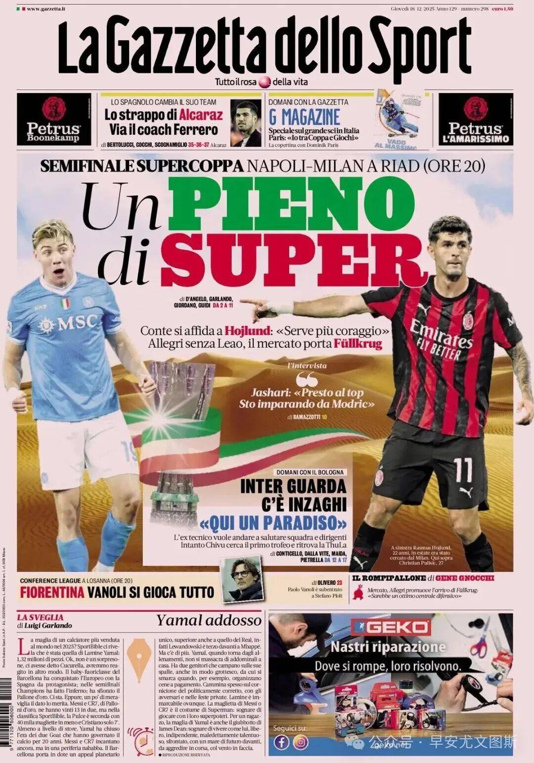 1. รอบรองชนะเลิศซูเปอร์คัพ: นาโปลีและเอซี มิลานปะทะกันที่ริยาดคืนนี้ คอนเต้พึ่งพาโฮยลุนด์: "เราต้องการความกล้าหาญมากกว่านี้" อัลเลกรีไม่มีเลเอา ตลาดซื้อขายนำเข้าฟูลครุก จาชารี: "กำลังพัฒนาอย่างรวดเร็ว เรียนรู้จากโมดริช"